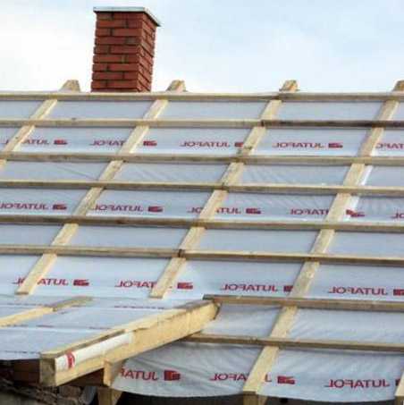 - Выполнять утепление кровли пенопластом можно и при уложенном кровельном материале, и при вскрытой кровле. В любом случае утеплительные работы следует начинать с монтажа гидроизоляции. Для этих целей лучше выбрать специальную гидроизоляционную пленку, имеющую мембранную структуру. Такая пленка будет выпускать водяные пары только в одном направлении. Установить ее нужно таким образом, чтобы она выпускала водяные пары из теплоизоляционного «пирога» наружу. Для этого ее нужно закрепить гладким слоем наружу. Гидроизоляционную пленку нужно укладывать на стропильные ноги без натяжки. Рулон пленки необходимо размотать во всю длину утепляемой крыши поперек стропилам. Полосы гидроизоляционного материала нужно укладывать внахлест от 10 сантиметров. Образовавшиеся стыки необходимо проклеить с помощью строительного скотча. Очень важно обеспечить зазор между обрешеткой и пленкой. Для этих целей поверх гидроизоляционной пленки на стропила прибивается бруски 50 миллиметров. В дальнейшем на эти бруски крепится обрешетка.