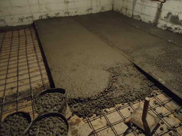 На бетонное основание укладывается обычная полиэтиленовая пленка с нахлестом на стены. На нее насыпается керамзит слоем в 10-15 см. Затем сверху обустраивается металлическая армирующая сетка и наливается немного жидкого цементного раствора. При застывании он создаст пленку, которая не допустит переувлажнения керамзитового слоя во время застывания основной стяжки.