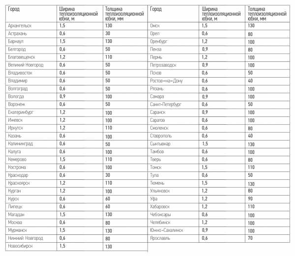 Какая необходима толщина теплоизоляции и ширина вылета «теплоизоляционной юбки» для зданий в разных климатических зонах?