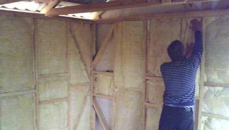 Чтобы утепление обошлось дешевле, возможно применение опилок, щепок, стружек, смешанных в отношении 10 к 1 с гипсом или извёсткой. Такую смесь нужно засыпать слоем в 20 см внутри обшивки.
