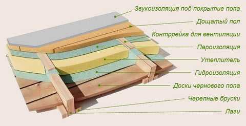 Схема утепления деревянного пола в бане - На них помещается брус.