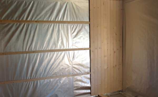 - Фольгированную пароизоляцию лучше использовать при каркасной технологии монтажа. При этом, набивая вагонку, между таким утеплителем и лицевой отделкой следует оставлять небольшой зазор (около 1 см) для создания воздушного пространства, исключающего образование конденсата.