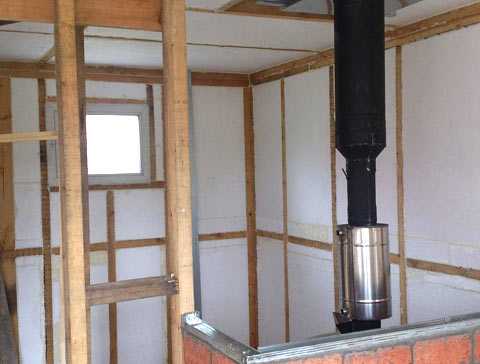 Пример утепления стен в бане пенопластомОчень комфортно работать с ним, распиливая инструментами, прикрепляя к нужным местам.