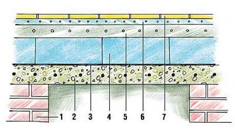 При утеплении бетонного пола слой теплоизолирующего материала укладывают на плиту перекрытия, которая защищена гидроизоляцией. Затем поверх утеплителя кладут армирующую сетку, на нее наносят цементную стяжку. После высыхания стяжки можно монтировать напольное покрытие — керамическую плитку.