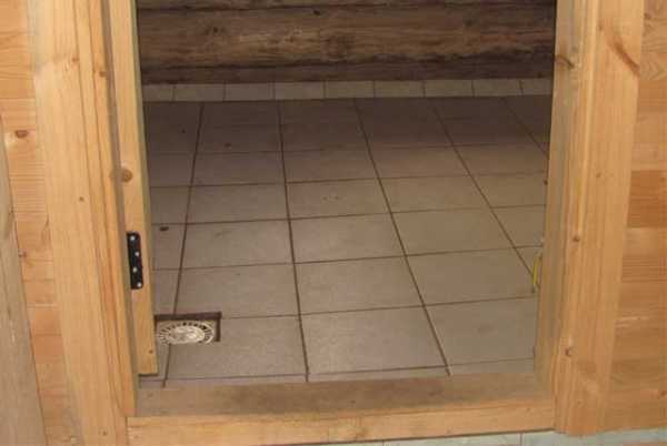 Такой способ укладки пола затрачивает больше усилий и денег, однако вы получите пол, который отлично сохраняет тепло. Вода отводится по наклонному полу в специальный лоток, расположенный в дальнем конце бани.