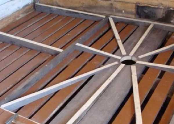 Вначале делается основание из лагов, на которое будут укладываться доски для будущего пола. Сосна или лиственница подойдут лучше всего для лагов, правильный выбор дерева имеет большое значение. Обязательно нужно сделать перепад в конструкции при сборке лаг, чтобы получился наклон для стекания воды. Так как на лаги приходится большая нагрузка, то они могут прогнуться. Во избежание такой неприятности, следует сделать подпорку для брусьев. Под них делают невысокие столбы из кирпичей или бетона. Площадь из железобетона делается под кирпичные столбцы, толщина не меньше 20 см, а выступать должна вокруг столбов на 7 см.