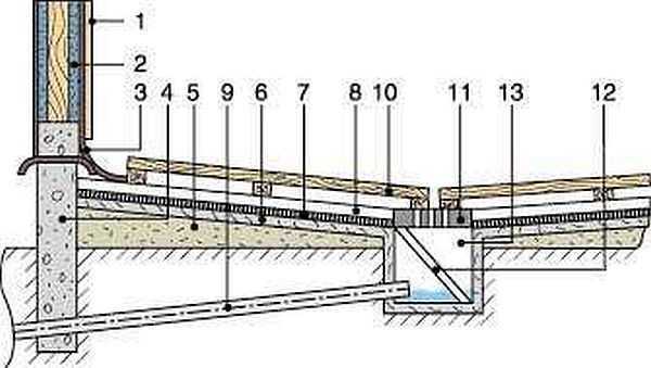 Слой бетона – им заливается гравий.- Пароизоляция и войлочный утеплитель.