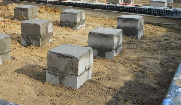 - Создание каркаса, для чего из бетона следует вылить стойки, а сверху на них установить подставки (из кирпича или бетона). Далее, следует положить одним слоем рубероид или другой гидроизоляционный материал, что поможет защитить древесину от впитывания влаги из бетона и преждевременного гниения. Затем на него укладывать сами лаги параллельно узкой стене бани, оставляя 3 –4 см до стен. Это обеспечит лучшую циркуляцию воздуха. При столбчатом фундаменте высоту, на которую укладываются лаги, определяет высота закладного бруса, а при ленточном фундаменте – высота бетонных лент.