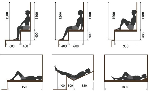 Вероятно, потребуются скамеечки для ног, чья высота будет равняться 40-45 см. Ногам будет удобно, если сидеть на полке, а скамеечку использовать как нижний ярус. Ширина лежака так же индивидуальна, как и высота. Основное правило — комфортное лежание.