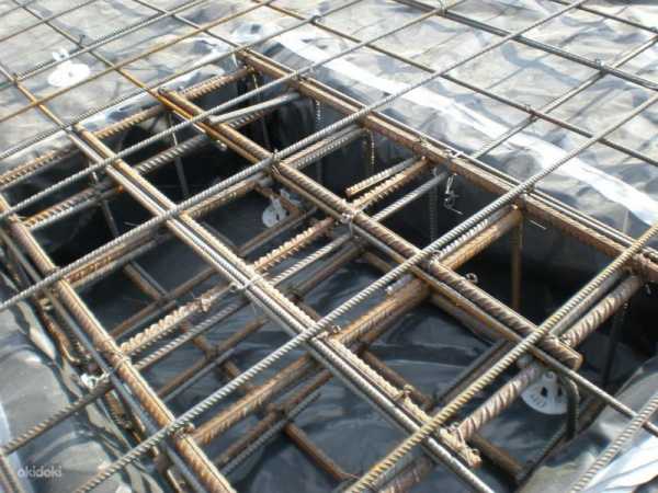 - Монтаж армирующего слоя. На слой гидроизоляции необходимо уложить армирующий слой в виде сетки из стальной арматуры диаметром 12-16 мм. Если гараж имеет большую площадь или предназначен для тяжелого автомобиля, то армировка осуществляется в 2 слоя. В местах пересечения армирующие стержни связываются между собой стальной проволокой.