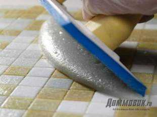 Наиболее распространенным считается метод с использованием резинового шпателя. Так как работать придется не сразу на всей территории, а обрабатывать плитку буквально по квадратному метру, специалисты рекомендуют непосредственно перед самим процессом еще раз смочить пару «квадратов» водой. Вообще профессионалы обрабатывают 2-3 кв. м минут за двадцать. Начинающему мастеру достичь такой скорости не удастся, но и это не столь важно. Главное здесь – аккуратность и тщательное соблюдение технологии. Ну а то, что вы закончите работу на час или два позже, особого значения не имеет.