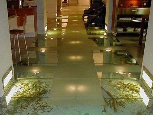 Сразу хотим отметить, не нужно путать наливные полы из жидкого стекла с жидким стеклом для гидроизоляции помещения, поскольку это совершенно разные вещи. Для гидроизоляции применяют жидкое стекло, которым промазывают стыки между плитами и угловые соединения. Для создания наливных полов применяется многокомпонентные полимерные смеси, которые в большинстве случаев имеют прозрачный вид. Такой полимерный прозрачный пол очень похож визуально на жидкое стекло и после укладки создаёт идеально гладкую и глянцевую поверхность, которая всем своим видом напоминает натуральное стекло.