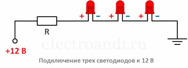 Подключение трех светодиодов к источнику питания 12 В, позволяет использовать резистор с меньшей мощностью, так как суммарное падение напряжения на трех светодиодах будет больше в 3 раза.