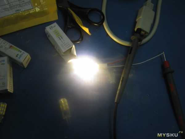 Ну что, приступим к проверке. Ожидания, признаться, были самыми противоречивыми думал или не засветятся вообще, либо загорятся и потухнут, либо взорвутся, но все обошлось. Все десять лампочек засветились, причем нерабочие элементы отсутствовали. Свет заказывал «Теплый белый» но на мой взгляд, он ближе к холодному спектру.