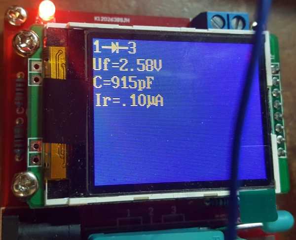 Все выяснилось, когда я начал измерять токи отдельно на каждом диоде, при их совместной работе. Некоторые показания «зашкаливали», некоторые были очень малы. Все стало ясно, светодиоды все разные, либо из разных партий, либо это брак! Для верности я сделал замеры на транзистор-тестере, так же полученном в виде конструктора из Китая, его сборка не обошлась без приключений. В нем был плохо пропаян шлейф монитора, после припайки, прибор начал работать (и китаец потерял в диспуте 50% стоимости прибора). Тесты на приборе, подтвердили мои опасения, светодиодов одинаковых не было! По напряжению более или меннее «в куче», но остальное… в общем смотрите на фото.