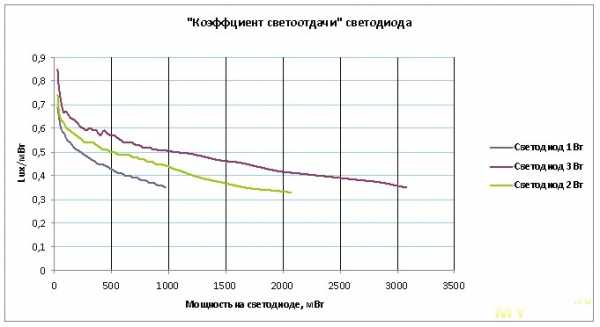 Ещё раз доказал практически, что «энергоэффективность» светодиода зависит от той мощности, которую через него пропускают. Чем меньше ток, тем выше эффективность. И без разницы, какой светодиод 1Вт, 2Вт или 3Вт. Всё равно, при уменьшении мощности эффективность будет расти.