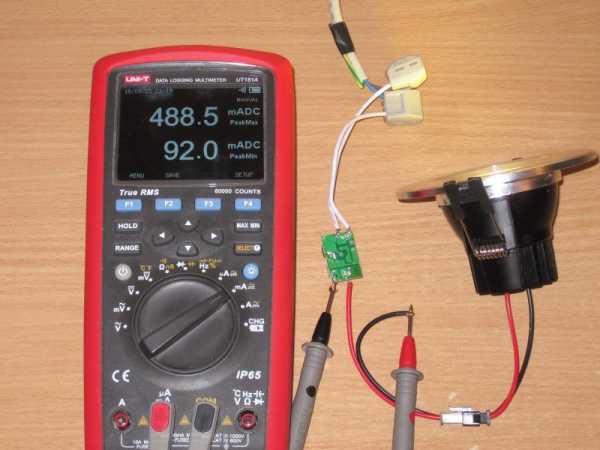 А это уже просто эксперимент, при работающем светильнике, включенном через мультиметр, включил режим отображения максимального и минимального пикового тока и через несколько секунд прибор показал насколько ток отличается. Пиковый максимальный почти 500 мА, минимальный чуть меньше 100 мА.