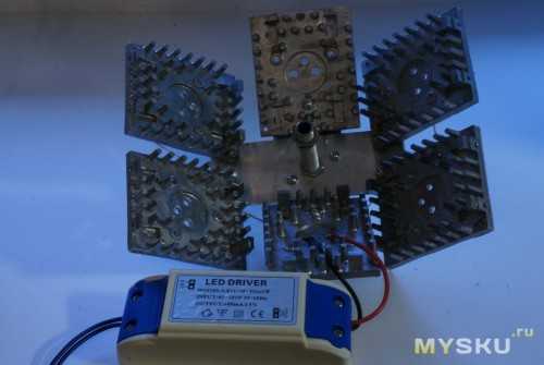 В целом экспериментом доволен, хотя применение специализированных радиаторов сделало бы конструкцию более компактной и не такой «страшной». Да и алюминиевые площадки для монтажа дают более качественный монтаж и хороший теплоотвод. Стандартные стеклышки люстры дали нормальное рассеивание.