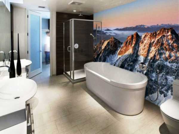 Но эти обои могут выдерживать воздействие влаги. Так что если вентиляция хорошо работает, от пара защищает занавеска, ими можно украсить ванную комнату. Например, о ванной с окном в европейском стиле практически каждый человек задумывался. С обоями 3d легко осуществить мечты.