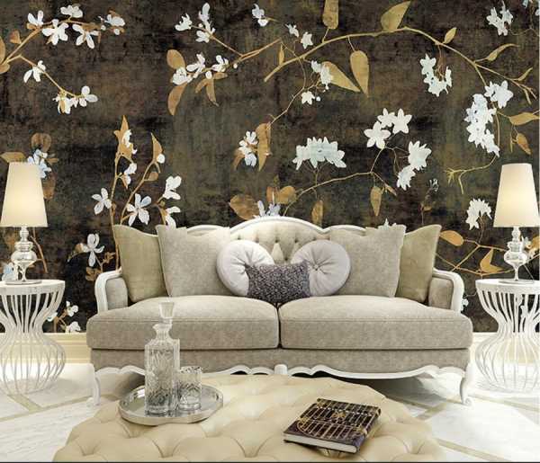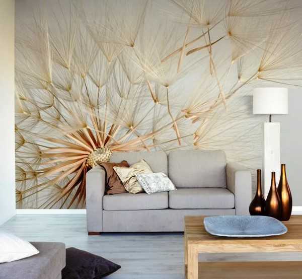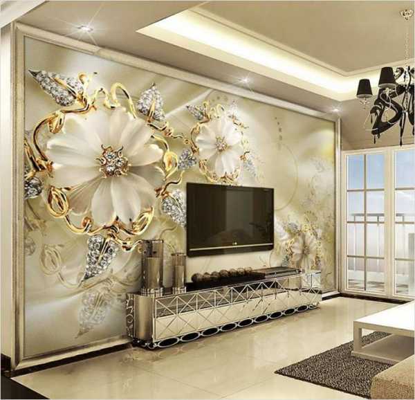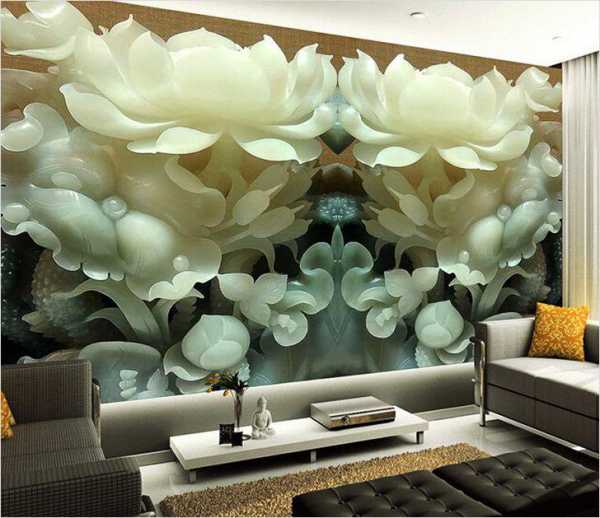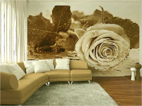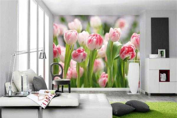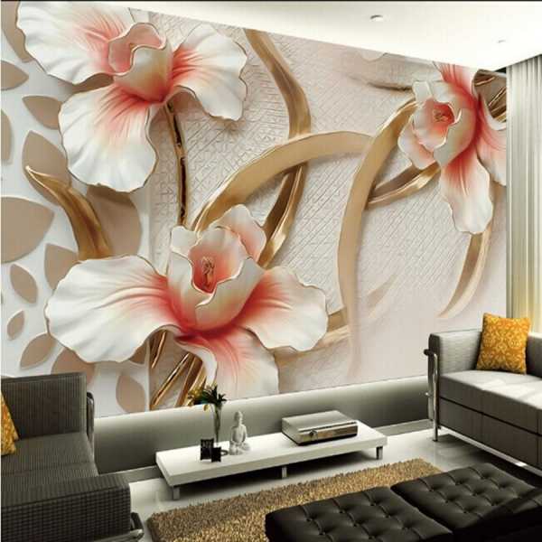Идеальным вариантом для гостиной являются фотообои 3д для стен, на которых изображены цветы.