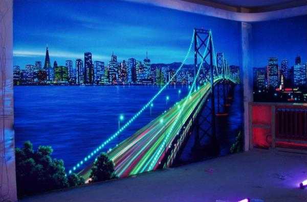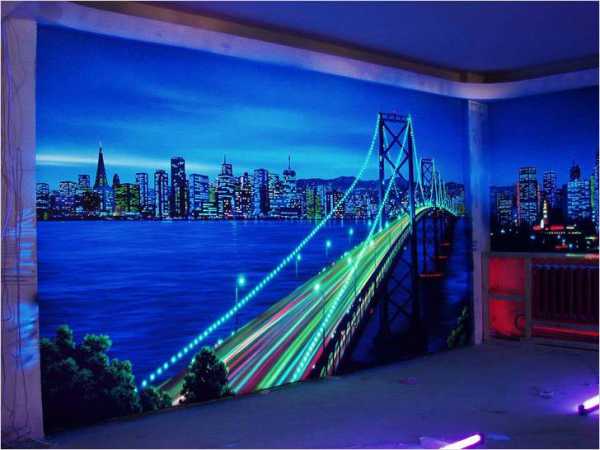 - Флуоресцентные. Днем эти обои выглядят обыкновенно, но все меняется с приходом темноты, под светом люминесцентных ламп на обоях проявляется светящееся неоном изображение. Создадут волшебную атмосферу в детской или спальне.