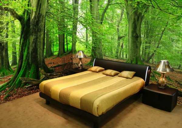 В спальню необходимо подбирать такие отделочные материалы для стен, которые бы способствовали созданию спокойной и гармоничной обстановки. Поэтому при желании приобрести для комнаты отдыха обои с объемным эффектом, выбирайте изображения с пляжем, лесом, красивым парком.