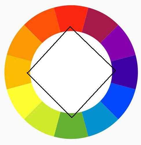 Квадратная схема – это сочетание четырех равноудаленных по цветовому кругу цветов.