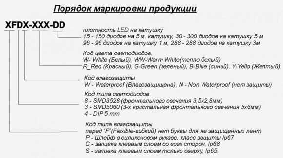 Что обозначают сокращения и аббревиатуры из цифр и букв в полном названии марок светодиодных лент: