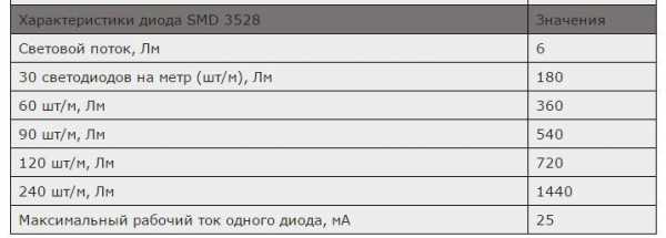 Сравнение технических характеристик светодиодных лент SMD3528, 5050, 5630, 5730 сведенные в одну таблицу: