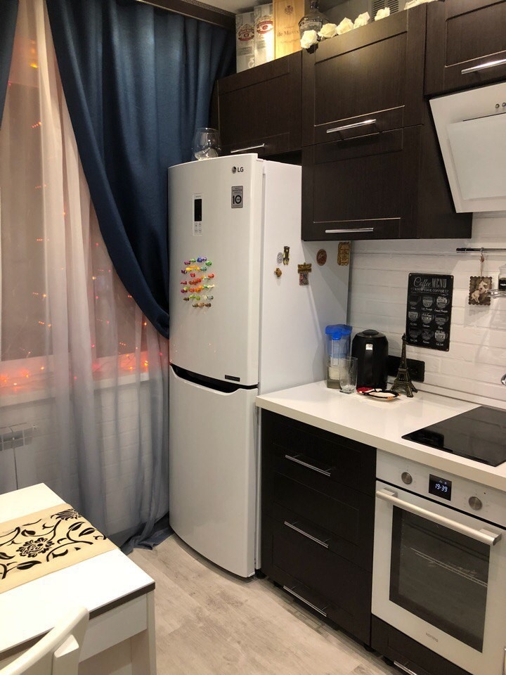 Планировка и ремонтные работы в шестиметровых кухнях в корабельном здании ленинградского типа — серьезная проблема. При наличии необходимых техусловий, полный демонтаж стенок разумнее организовать частичным сносом. В такой ситуации перегородка между кухонным помещением и жилой комнатой заменяется арочной конструкцией, а главный проем перекрывают с помощью листов ГКЛ. В сформировавшейся нише можно разместить холодильное оборудование, сделать полочки для хранения.