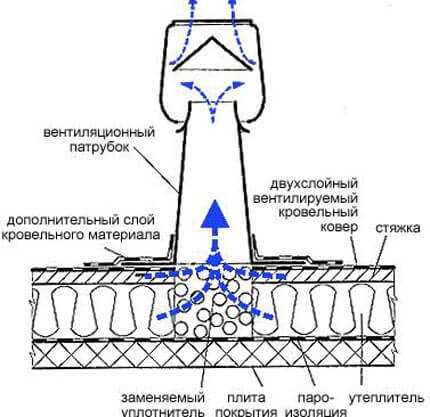 Установка кровельных аэраторов выполняется следующим образом:- В кровельном ковре и стяжке вырезается окно до слоя утеплителя в том месте, где будет смонтирован вентиляционный патрубок.