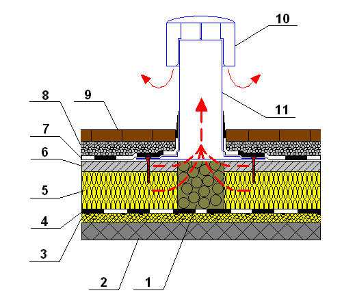 Схема устройства аэратора для эксплуатируемой кровли: 1 – керамзит; 2 – железобетонное перекрытие; 3 – легкий бетон – разуклонка; 4 – пароизоляция; 5 – утеплитель; 6 – стяжка; 7 – гидроизоляция; 8 – засыпка из промытого гравия; 9 – тротуарная плитка; 10 – защитный колпак; 11 – корпус аэратора.