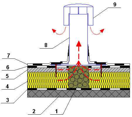 Схема устройства аэратора для неэксплуатируемой кровли: 1 – керамзит; 2 – железобетонное перекрытие; 3 – пароизоляция; 4 – утеплитель; 5 – стяжка; 6 – нижний слой гидроизоляции; 7 – верхний слой гидроизоляции; 8 – корпус аэратора; 9 – защитный колпак.