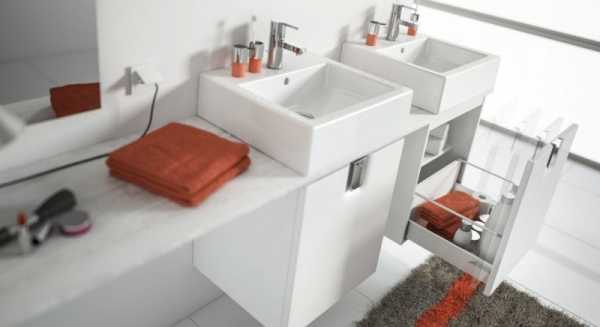 Если метраж позволяет разместить в ванной тумбочку, можно обустроить в ней врезную раковину. Для этого необходимо на верхней поверхности сделать проем и погрузить в него чашу.