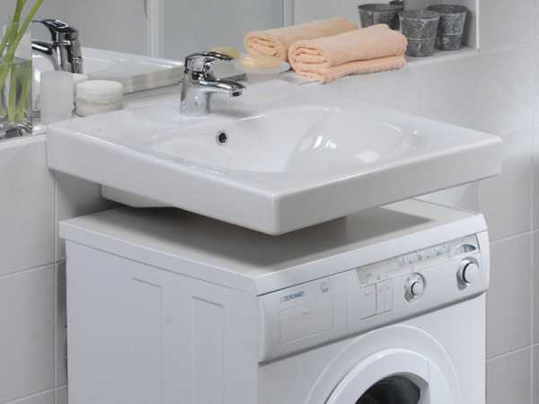 В целях экономии свободного пространства в ванной комнате можно разместить умывальник данного типа непосредственно над стиральной машинкой.