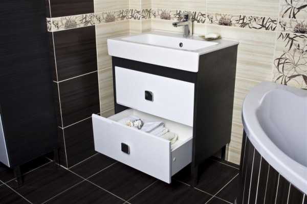 Сейчас в продаже имеются уже готовые комплекты, включающие дополнительно зеркало, смеситель. Достоинство установки в том, что дверцы спрячут все коммуникации, а сама тумба послужит вместительным хранилищем для косметических и гигиенических средств. Иногда в такую тумбу помещают стиральную машину. Кроме того, останется часть пустующей поверхности столешницы, которая послужит полочкой. Следует отметить, что этот способ позволит установить тяжелые виды раковин, например, выполненные из натурального камня.