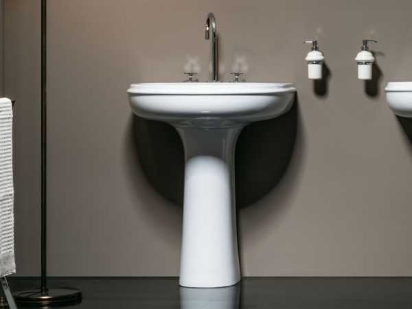 - Умывальники на пьедестале или полупьедестале – это модель с колонной, в которую прячут трубы и сифон. Вариант классический, но от этого не менее известный.