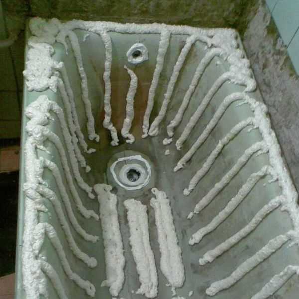 После этого двухкомпонентной пеной создаем решетку по всей поверхности ванны. Расстояние между полосами двухкомпонентной пены — около 10 см, на дне — чуть меньше. Схема нанесения произвольная, но распределяться вещество должно равномерно. Можно за основу взять фото. Пену надо наносить быстро — время начала полимеризации 15 минут, до этого времени надо установить вкладыш на место.