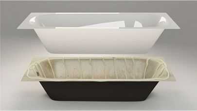 Есть две технологии производства акриловых вкладышей в ванную. Первая технология — формование вкладыша из разогретого листа сантехнического акрила в специальной пресс-форме. Эти вкладыши называют еще литыми. Вторая технология — композитные (комбинированные) вкладыши. Основу делают из АБС пластика, после чего внутренняя поверхность покрывается тонким слоем акрила.