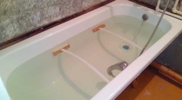 - Залив водой. Закрепленный акрил нуждается в дополнительном прессе, для этого ванну заполняют водой и оставляют на сутки.