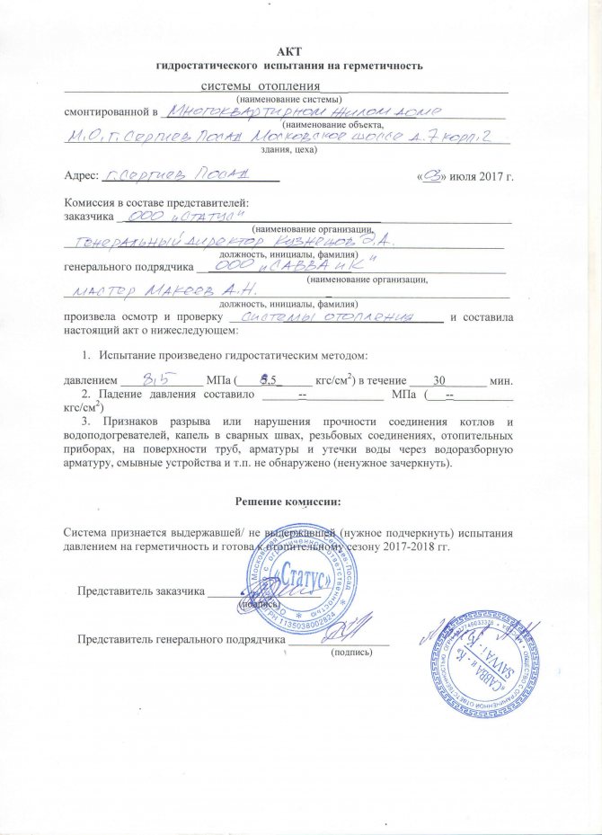 Акт опрессовки теплотрассы подписывают в день, когда система тестировалась. Этот документ должны завизировать ответственные лица предприятия, проводившего работу, а также органа технадзора и управляющей компании.