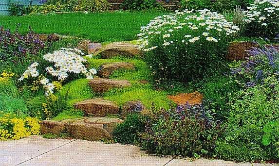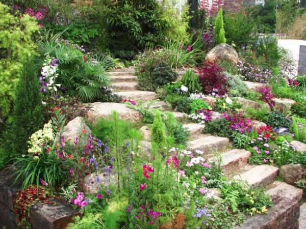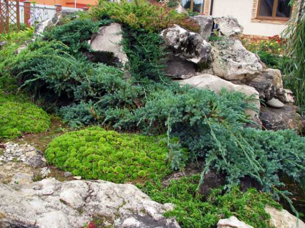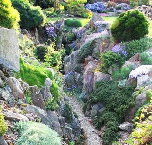 - горный склон – сложная высокая композиция из камней разного размера и с большим разнообразием стелющихся и низкорослых растений;