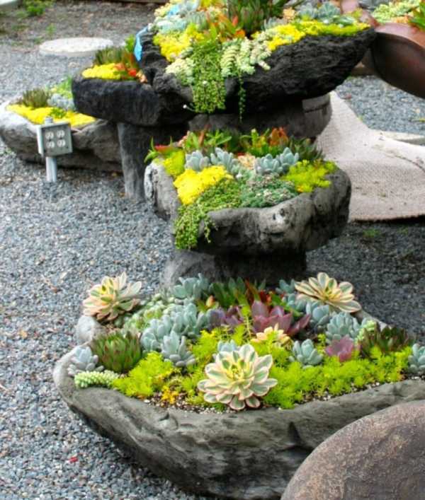 Креативное украшение альпинариев — глиняная чаша с растениями