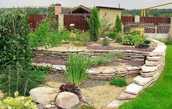 Высокая горка, сложена из камней и зеленых насаждений, может служить ограждением участка