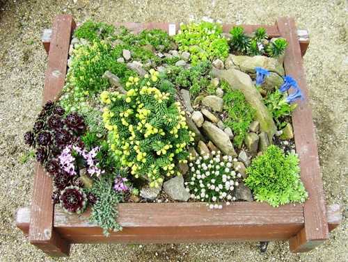 В качестве емкости для воссоздания маленького кусочка горной природы можно использовать каменную вазу, деревянные ящики, большую керамическую посудину. Главное, чтобы в выбранном контейнере было отверстие для стока воды.