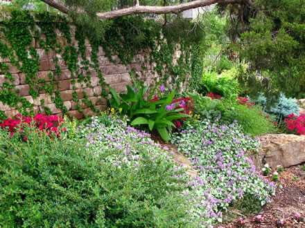 | Скальная стенка | Основу составляет невысокий (до метра) бордюр, выложенный из камней плоской формы. В щелях между камнями хаотично высаживаются растения. |