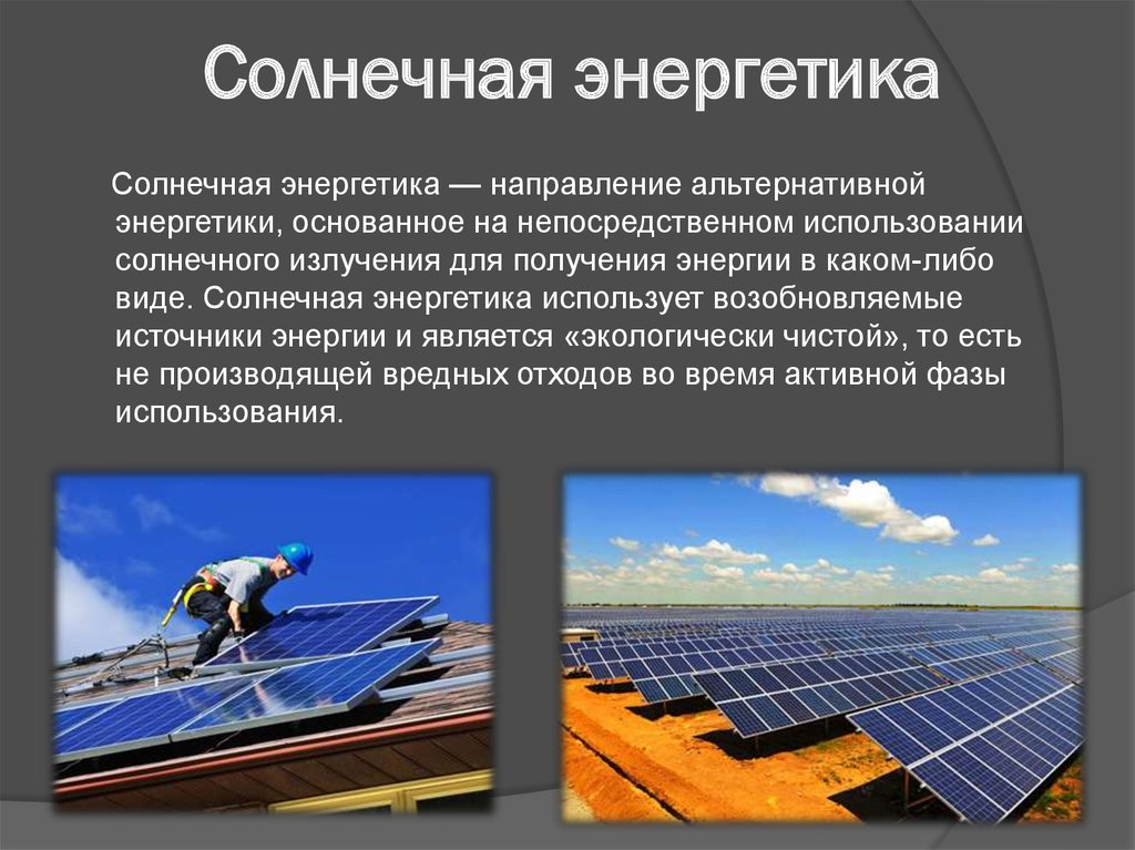 Солнечную энергию преобразуют в электрическую посредством солнечный батарей. Удивительно, но всей планете на год хватило бы энергии, которую Солнце отправляет на Землю в течение одного дня. При этом выработка электроэнергии солнечными батареями не превышает 2% от общего количества. Однако солнечная энергия — одна из самых экологичных, безопасных и недорогих по себестоимости.
