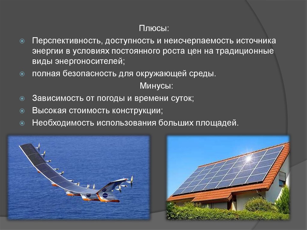 Пожалуй, единственным недостатком солнечной энергии является зависимость ее получения от времени суток и погодных условий. В северных странах строительство солнечных электростанция экономически невыгодно.