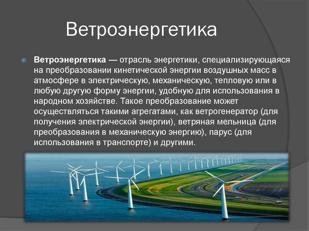 Ветровая энергетика — преобразование энергии движущихся воздушных масс в электричество, которое может быть использовано потребителем.