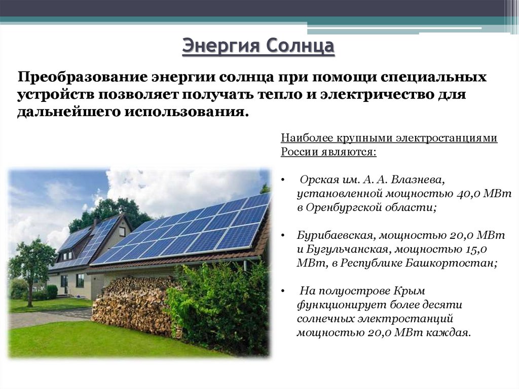 В нашей стране солнечная энергетика получает все большее распространение в качестве резервного источника электрической энергии.В России суммарная мощность электростанций, работающих на энергии Солнца, составляет 400,0 МВт. Проектируются новые станции, мощность которых будет составлять 850,0 МВт. Широко обсуждается проект создания космических солнечных электростанций. В открытом космосе преграды для солнечной радиации в виде атмосферного слоя отсутствуют. Поэтому возможен запуск на орбиту установок, оснащенных солнечными батареями, улавливающими энергию Солнца и пересылающих их на землю. КПД таких станций потенциально обещает быть приближенным к 100%, однако на данный момент их создание и запуск обойдется настолько дорого, что себестоимость энергии для потребителей получится слишком высокой.